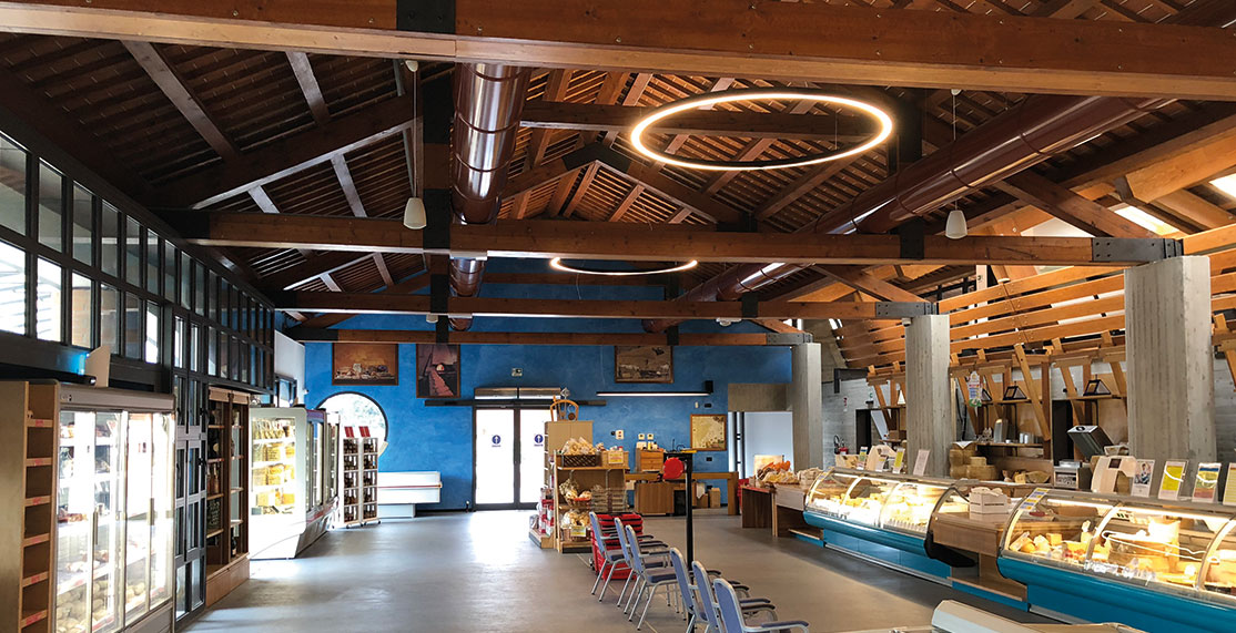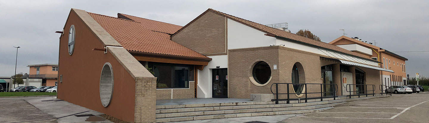La struttura esterna dello spaccio è rivestita con mattoni a vista, mentre l’ampia copertura è in legno massiccio e tavelline.