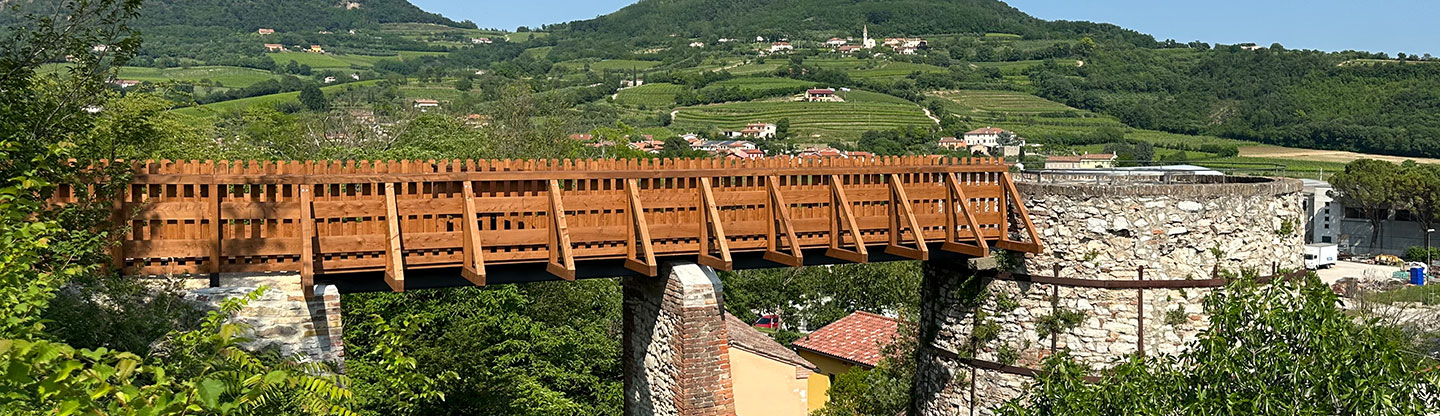 La precedente struttura lignea è stata completamente rimossa e sostituita con una nuova, realizzata in larice massiccio, mantenendo dimensioni, sezioni e tipologia di materiale identiche. La nuova struttura in legno è stata saldamente fissata alle putrelle metalliche esistenti tramite staffe in ferro, garantendo stabilità e durabilità.