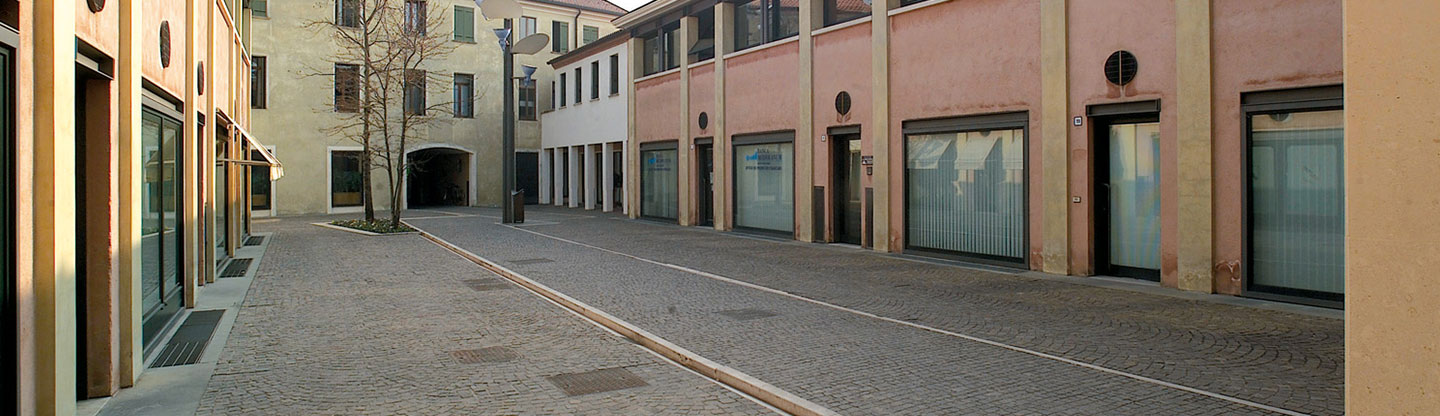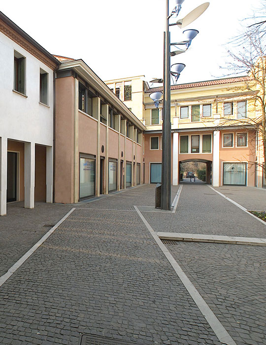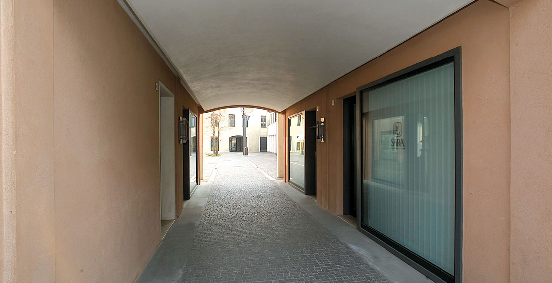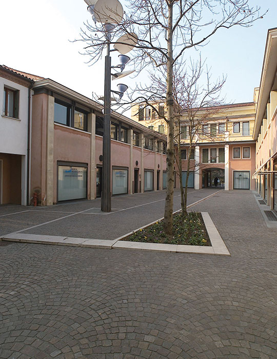 Il recupero degli edifici antichi è stato eseguito utilizzando grasselli e intonaci colorati, che arricchiscono le facciate esterne preservando il loro fascino originale e conferendo un tocco decorativo distintivo. La piazza centrale è stata pavimentata con eleganza utilizzando cubetti di porfido disposti a coda di pavone, una scelta che valorizza ulteriormente l’estetica dell’intervento architettonico.