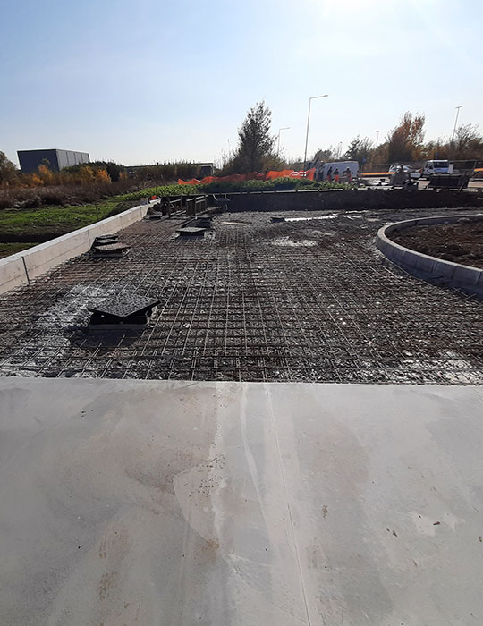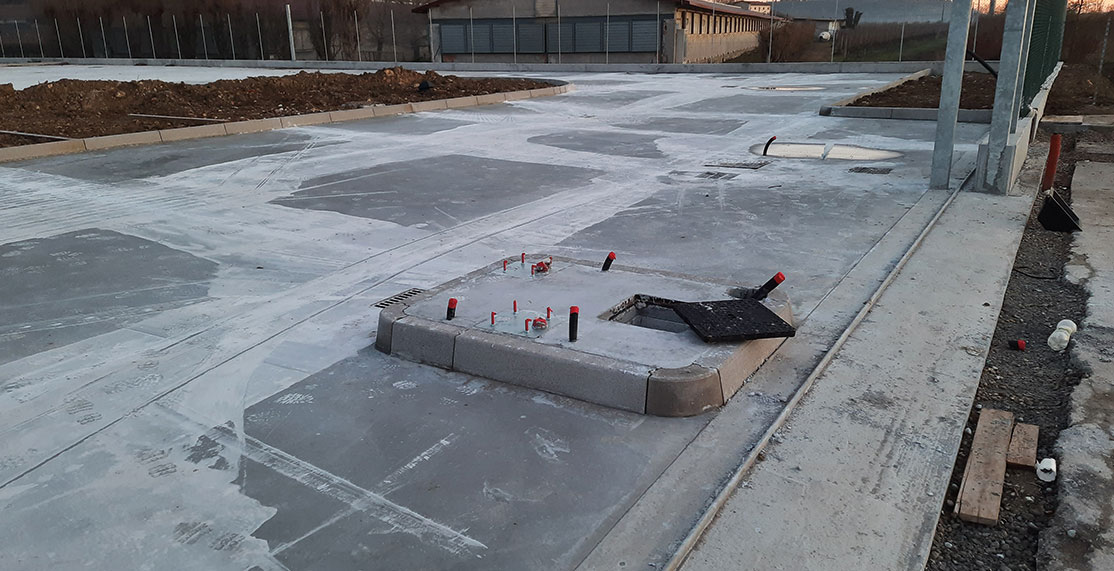 pavimentazione in calcestruzzo, l’installazione di cordonate, murette e aiuole di delimitazione per una migliore organizzazione degli spazi. Sono stati inoltre implementati sistemi di sub-irrigazione e una vasca di prima pioggia per la gestione delle acque meteoriche, essenziale per il rispetto ambientae.