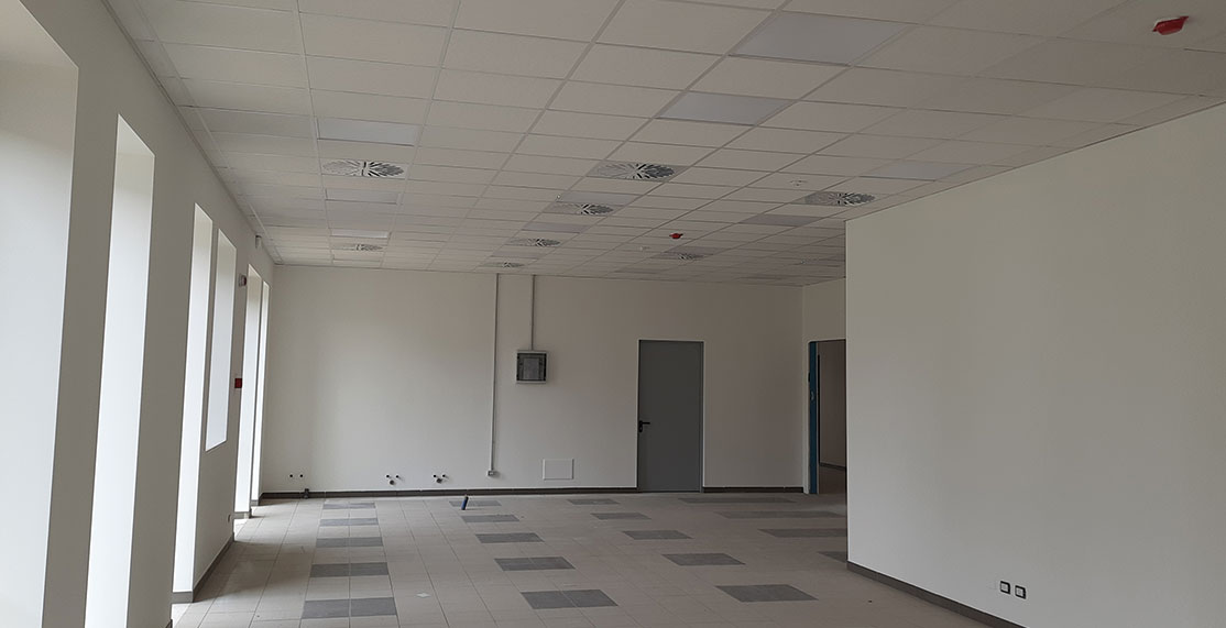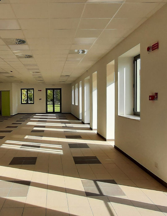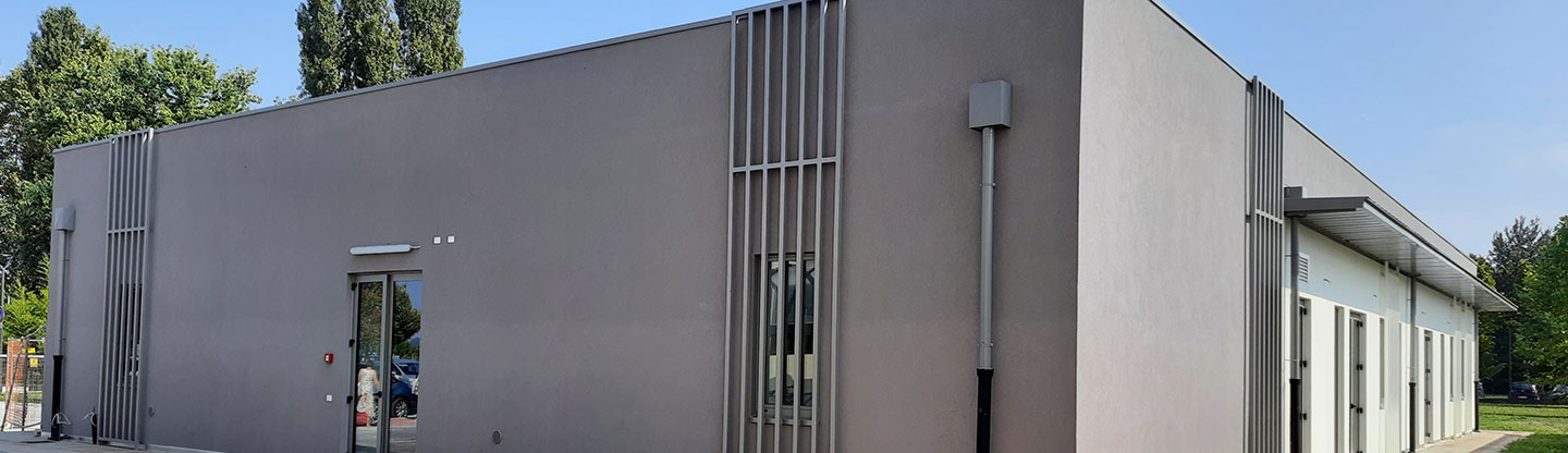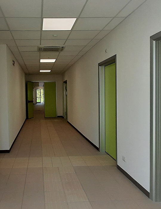 Realizzazione di un nuovo corpo edilizio rettangolare di un piano fuori terra. Collegamento con l’edificio scolastico esistente tramite ingresso principale che conduce al corridoio di distribuzione, separazione tra sale cucina e sala ristorante. Spogliatoi e servizi igienici collocati vicino all’ingresso, rispetto delle norme igieniche-sanitarie.