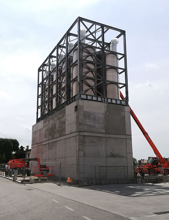 Progettazione e realizzazione di un silo destinato alla produzione di farina, concepito per garantire massima solidità e affidabilità strutturale.