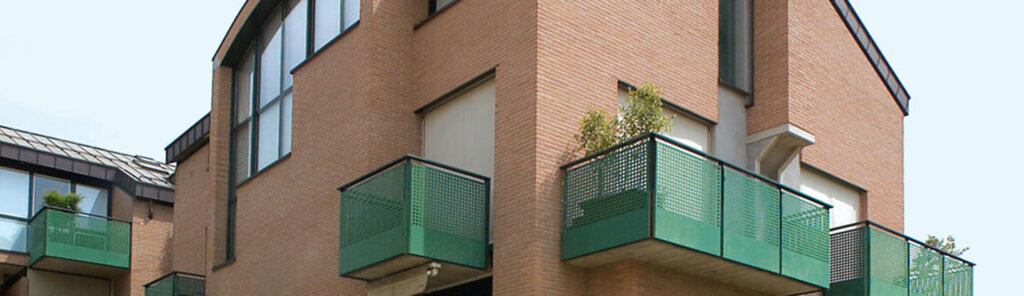 - Parapetti in acciaio verniciato di verde, un elemento distintivo che riprende la stessa finitura adottata per tutte le travi in acciaio della struttura.