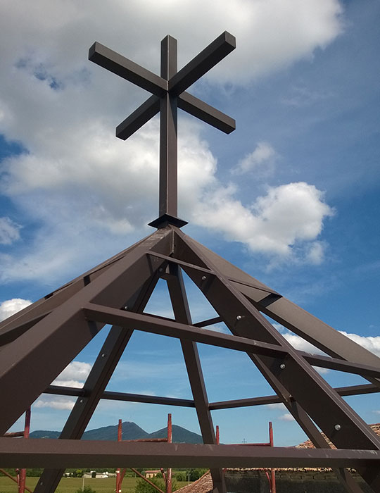 Il coperto della torre è stato completamente ricostruito utilizzando una struttura portante in carpenteria metallica, progettata per garantire resistenza e sicurezza. Sopra di essa è stato posato un tavolato in legno, con l’aggiunta di una lamiera in alluminio. Questa combinazione offre un equilibrio tra modernità e rispetto per l’architettura storica.