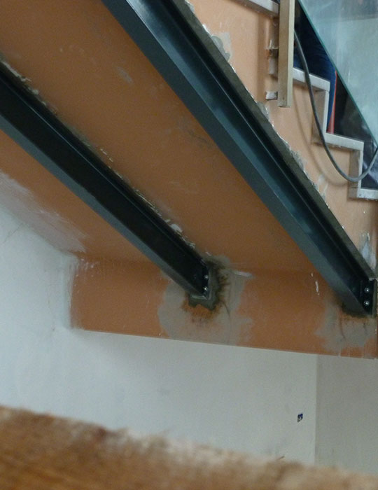 I gradini della scala presentavano significative carenze di resistenza a flessione che ne compromettevano la staticità e rendevano necessario un intervento urgente per aumentarne la sicurezza. - Soluzione progettuale e realizzazione dell’intervento