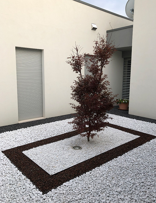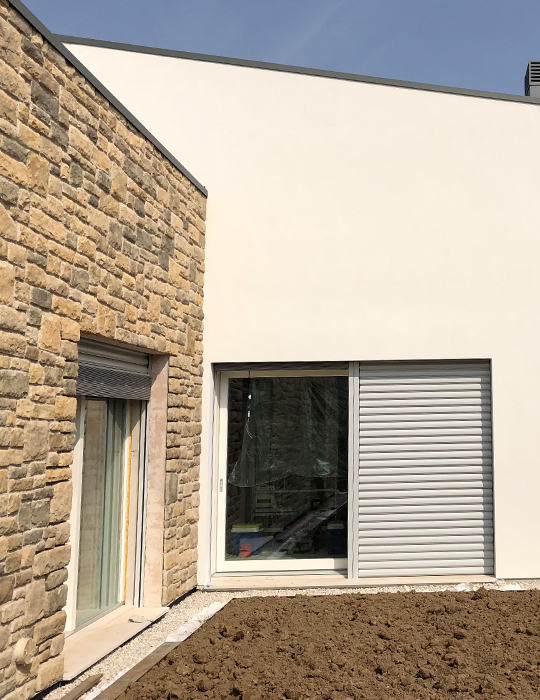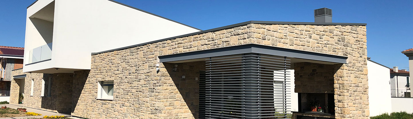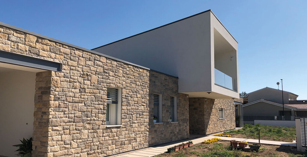 La prestigiosa villa all’interno di un tranquillo quantiere residenziale è stata rivestita con pietra nella zona a giorno, mentre nella zona notte e nella spaziosa rimessa presenta una finitura ad intonachino.