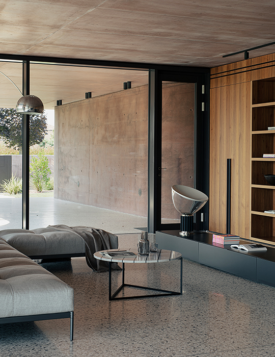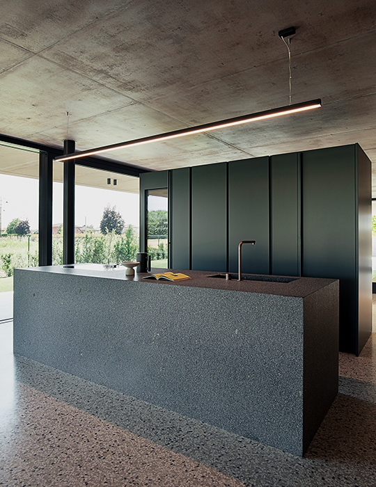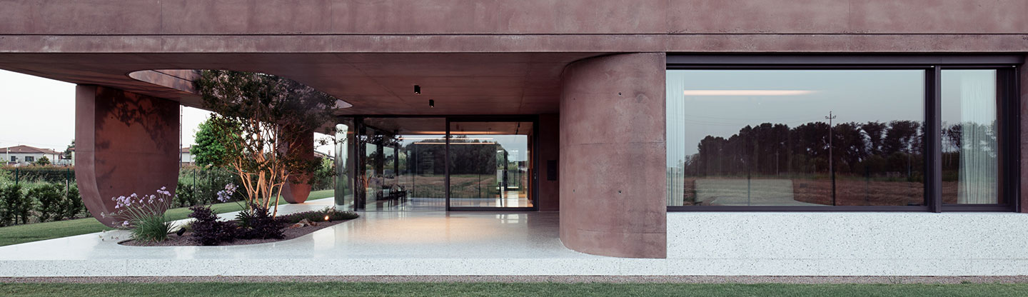 In un tranquilllo quartiere residenziale è stata realizzata un’abitazione ad un piano dalle spiccate connotazioni architettoniche: il calcestruzzo a vista colorato delle pareti e dei solai rende l’opera assolutamente unica.