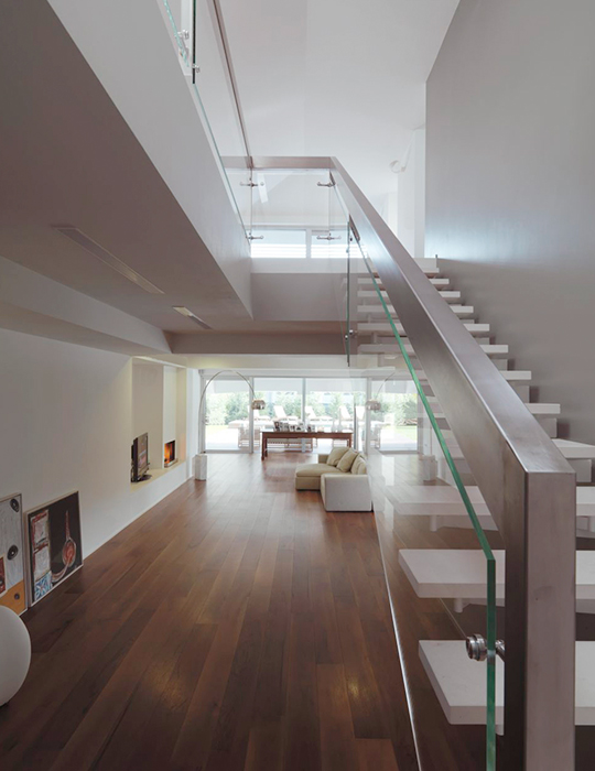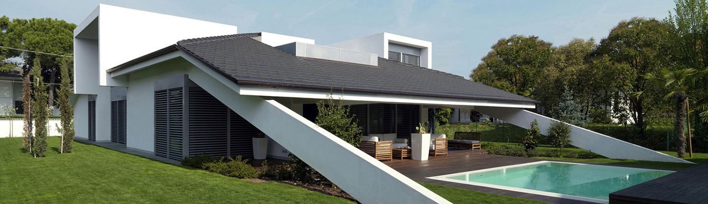 Sono rimaste le travi oblique in calcestruzzo che partendo dal tetto scendono a giardino vicino alla piscina, dando una nota caratteristica all’abitazione.